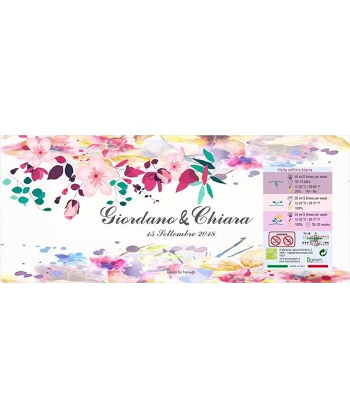 Unsere Bonboniere Mikrogärten-Blumen in der Dose können mit jedem Bild und jedem Text individuell gestaltet werden. Auch die Hintergrundfarbe kann personalisiert werden. Die individuelle Gestaltung erfolgt auf der gesamten Oberfläche der Dose.